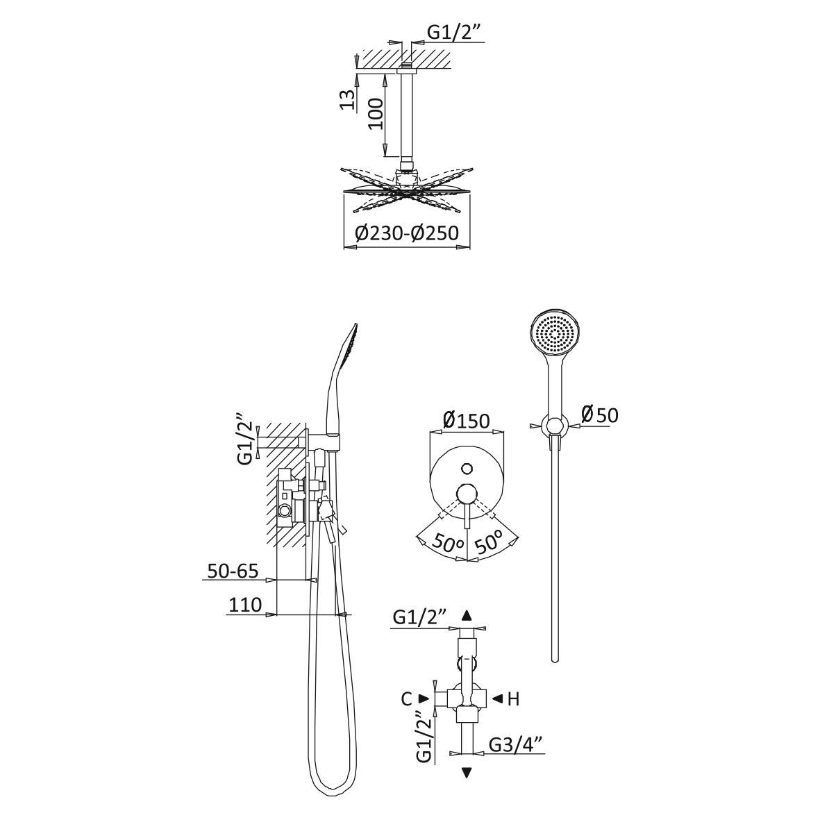 Zestaw natryskowy z deszczownicą, słuchawką, ramieniem i baterią podtynkową