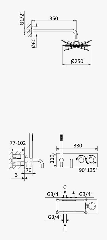 Bruma Lusitano Zestaw wannowo-natryskowy termostatyczny podtynkowy z deszczownicą Ø 250 mm ścienną Chrom 1383102CR