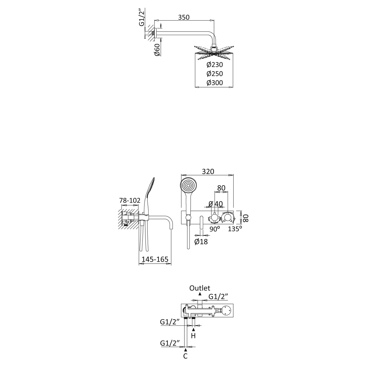 Bruma Lusitano Zestaw wannowo-natryskowy 250 mm Podtynkowy termostatyczny z ramieniem ściennym Pure white 1383102PW