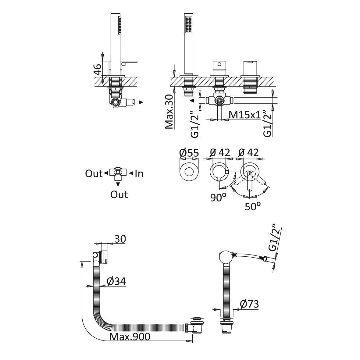Bateria 3-otworowa ze słuchawką, mieszaczem i przełącznikiem