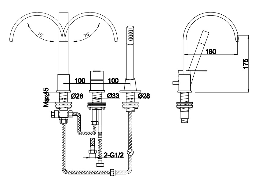 W komplecie wylewka, mieszacz oraz słuchawka z wężem.