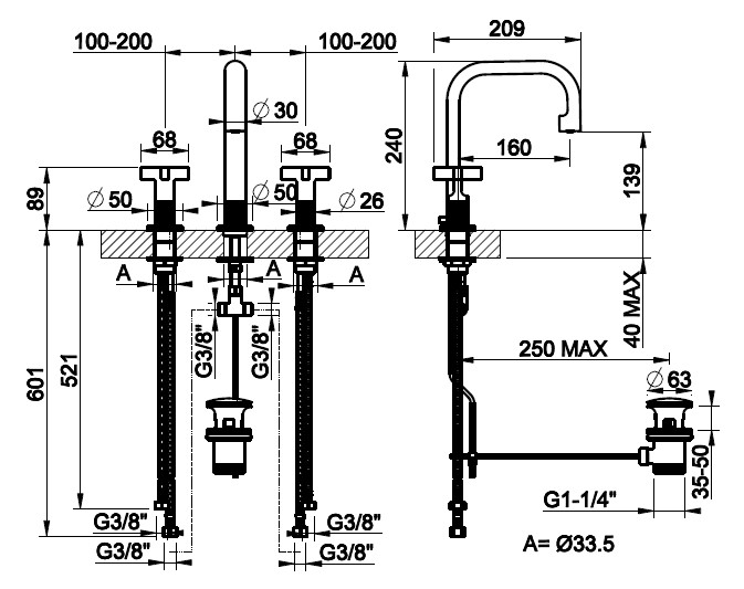 Gessi Inciso + Bateria umywalkowa 3-otworowa z korkiem chrom 58113.031