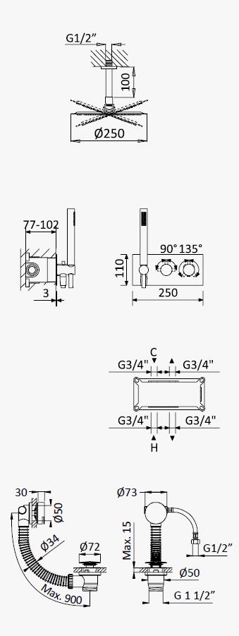Zestaw termostatyczny składający się z baterii, deszczownicy, słuchawki, węża i ramienia sufitowego