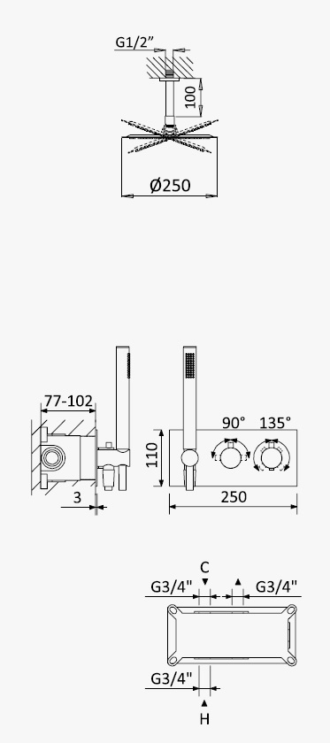 Naprawiono prysznic ścienny z ABS 250 mm, z obrotem i ramieniem sufitowym 100 mm