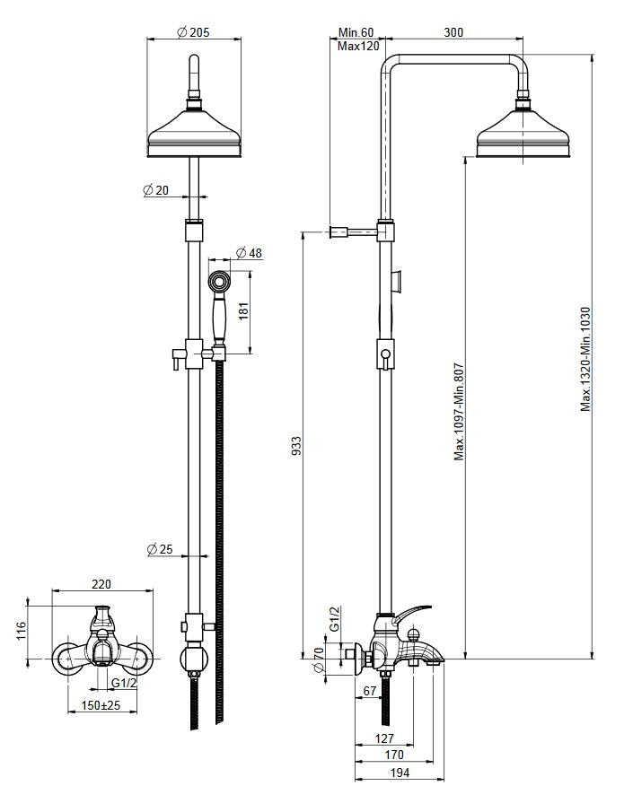 Carlo Frattini Lamp Bateria wannowo-natryskowa z deszczownicą Ø 20 cm i słuchawką Chrom F3304/2CR