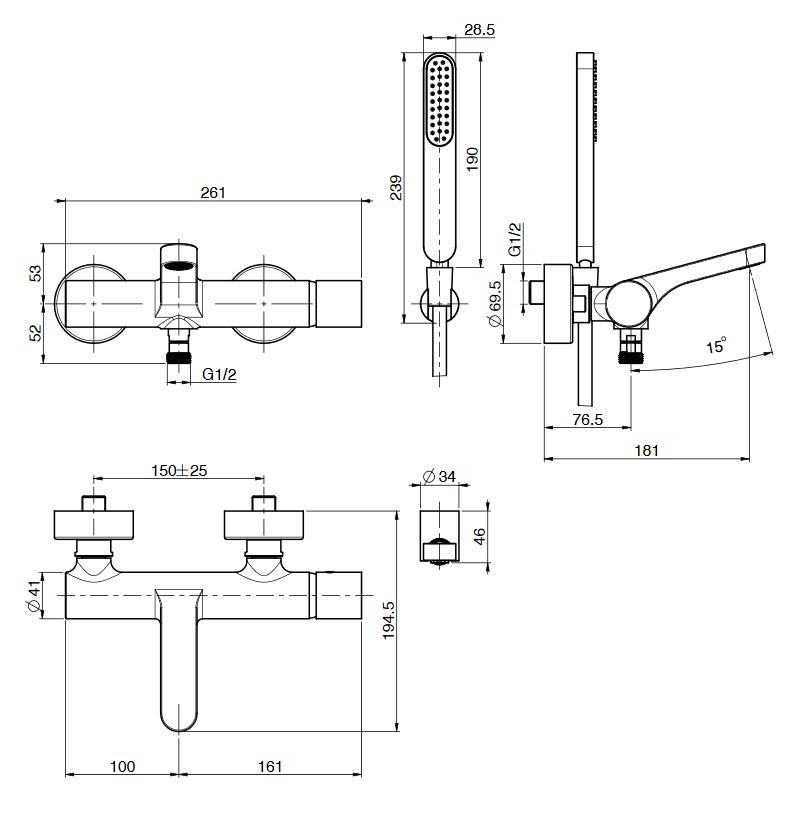 wysięg przyłącza natrysku: 76,5 mm