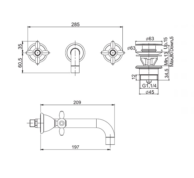 Carlo Frattini Olivia Bateria umywalkowa ścienna 3-otworowa z korkiem Chrom F5001L/5CR