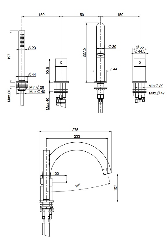 Carlo Frattini Spillo Steel Bateria wannowa nablatowa 4-otworowa Stal nierdzewna F3074INOX