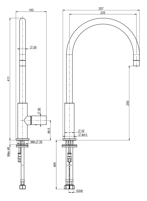 2 elastyczne węże przyłączeniowe 400 mmobrotowa wylewka