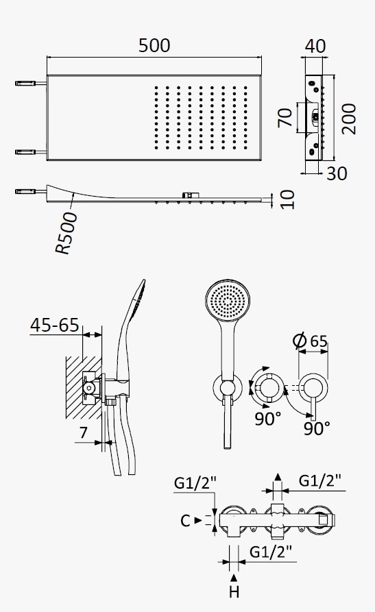 Zestaw składający się z baterii jednouchwytowej, deszczownicy i słuchawki