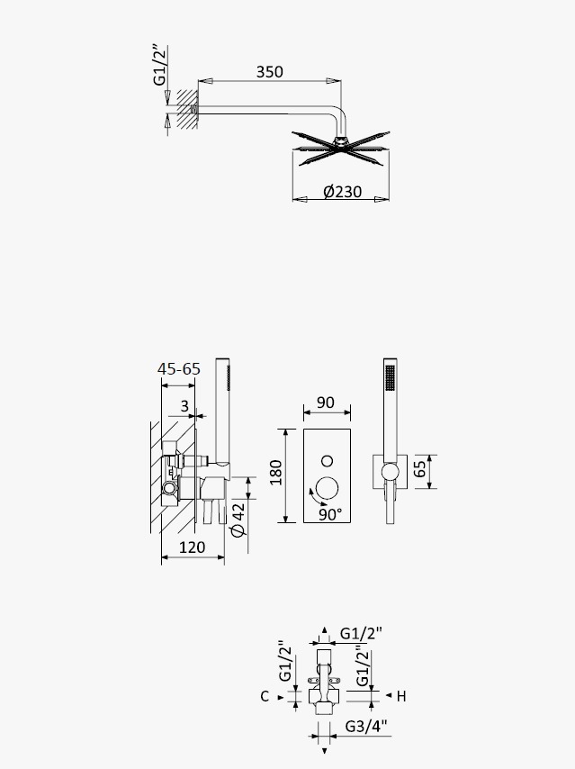 Zestaw natryskowy z deszczownicą, ramieniem, baterią i słuchawką.
