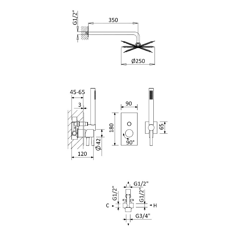 Zestaw natryskowy z deszczownicą, ramieniem, baterią i słuchawką.
