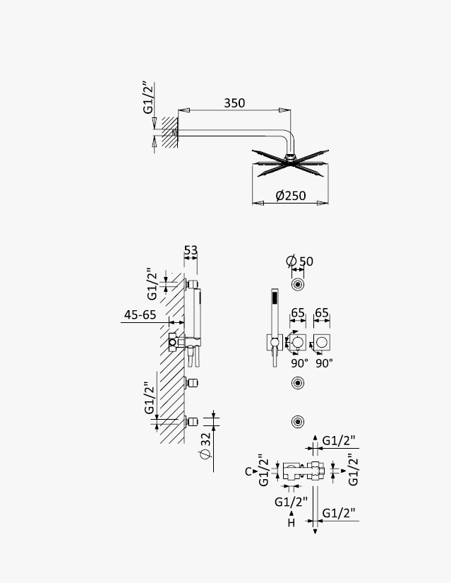 Zestaw natryskowy z deszczownicą, ramieniem, baterią, słuchawką i z 3 dyszami ściennymi