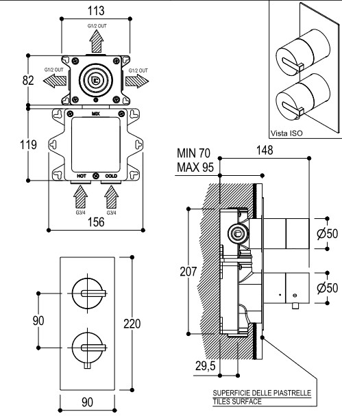 Ritmonio DOT316 Bateria wannowo-prysznicowa termostatyczna podtynkowa stal nierdzewna PR50HG101INOX