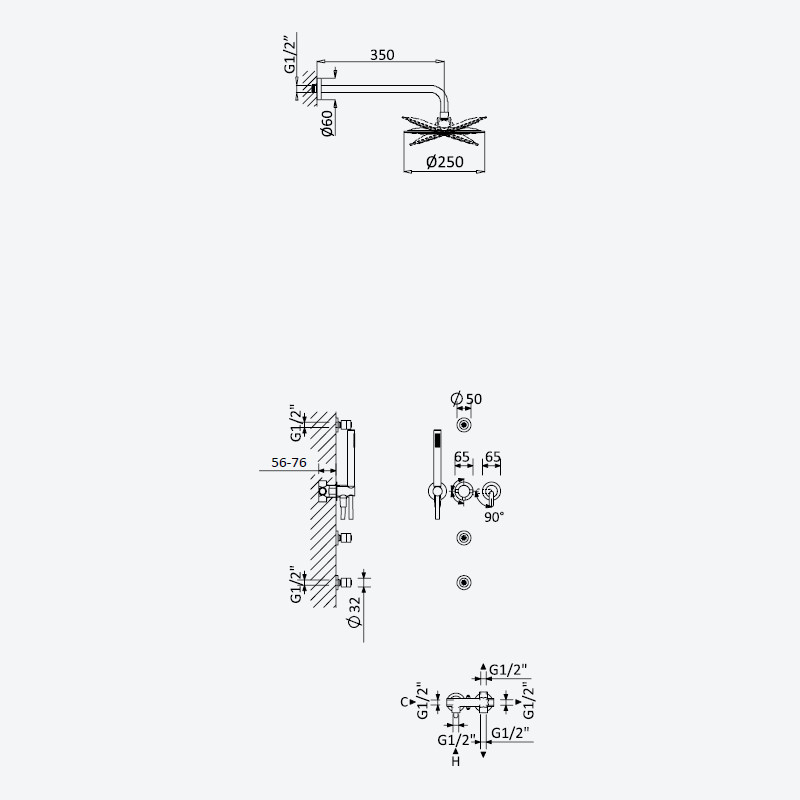 w skład zestawu wchodzi: deszczownica ścienną, bateria ścienna, 3 dysze podtynkowe i zestaw natryskowa