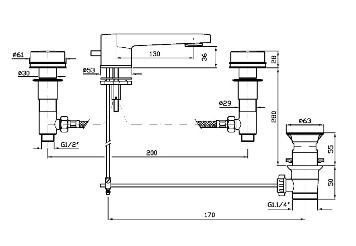 3-otworowa bateria umywalkowa z perlatorem, korek 1 ¼, wężyki elastyczne