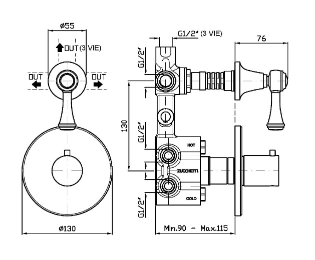 Zucchetti Agora Bateria natryskowa termostatyczna podtynkowa 1/2" z przełącznikiem 2/3-drogowym element zewnętrzny chrom ZAL646