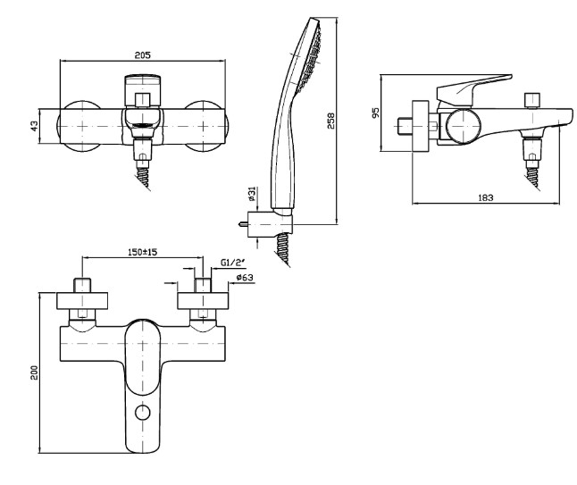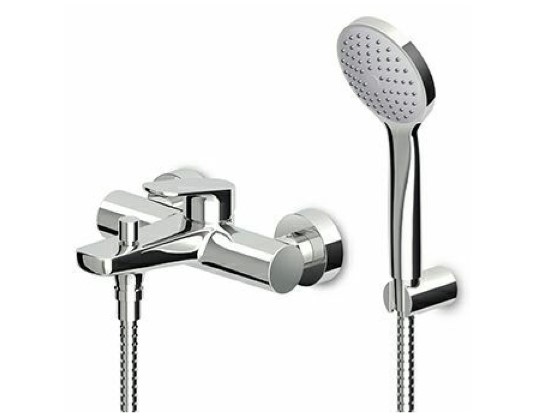 Jednouchwytowa bateria wannowo-natryskowa naścienna z przełącznikiem, zestaw natryskowy, z perlatorem.