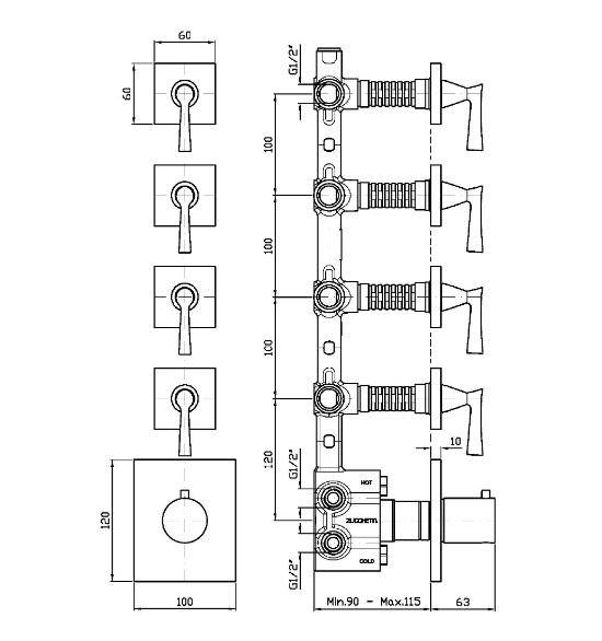 Zucchetti Bellagio Bateria natryskowa termostatyczna podtynkowa 1/2" z 4 zaworami odcinającymi element zewnętrzny chrom ZB2662