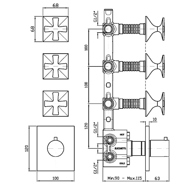 Zucchetti Bellagio Bateria natryskowa termostatyczna podtynkowa 1/2" z 3 zaworami odcinającymi element zewnętrzny chrom ZB1661