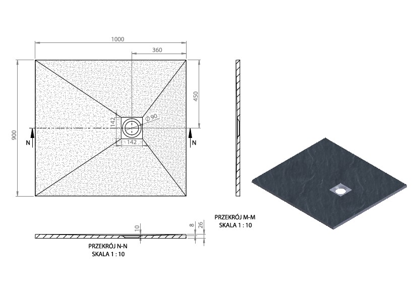 Brodzik Kronos w komplecie z nóżkami i imbusami. Maskownica odpływu w kolorze chrom, z jednej strony szczotkowana z zdrugiej strony polerowana.