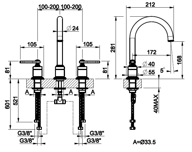 Gessi Venti20 Bateria umywalkowa 3-otworowa bez korka średnia chrom 65016.031
