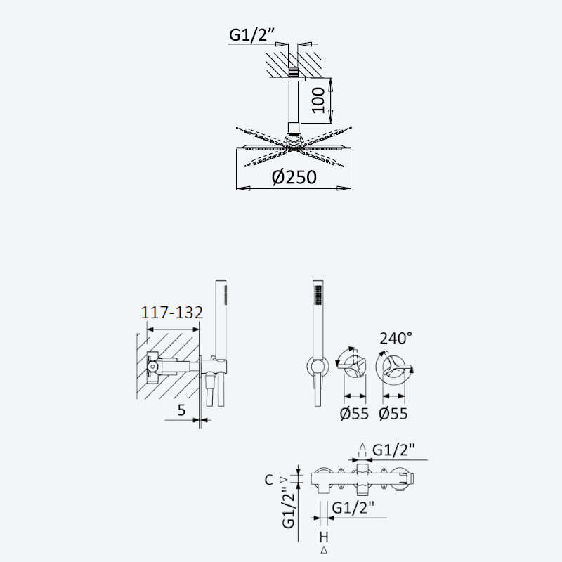 Bateria natryskowa podtynkowa z deszczownicą sufitową i zestawem: słuchawka prysznicowa, uchwyt z przyłączem