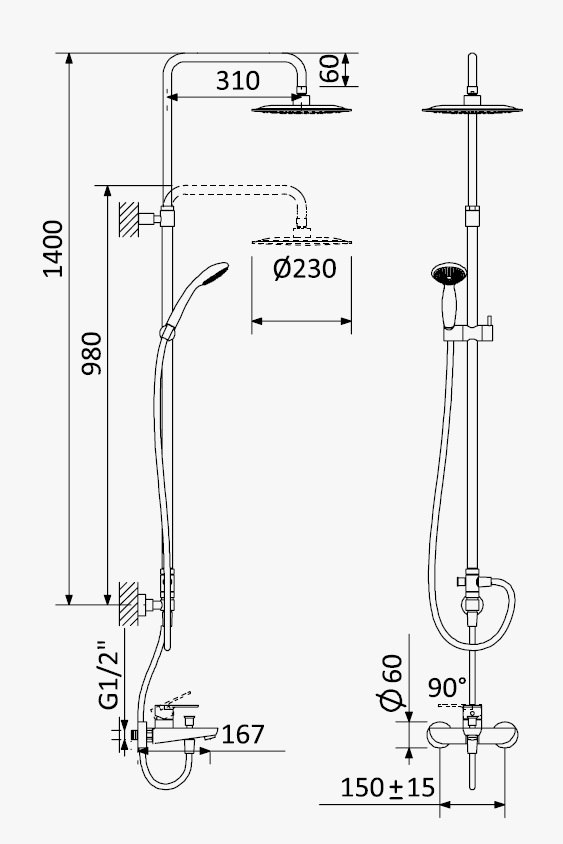 Bateria wannowo-natryskowa z deszczownicą na ruchomym drążku