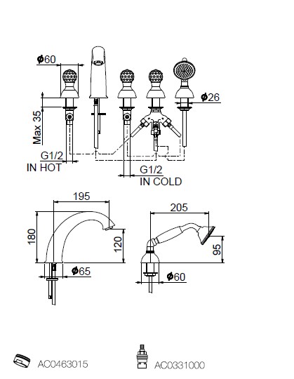 Webert Karenina Bateria wannowa 5-otworowa na brzeg wanny z wężem i słuchawką chrom KA730101.015