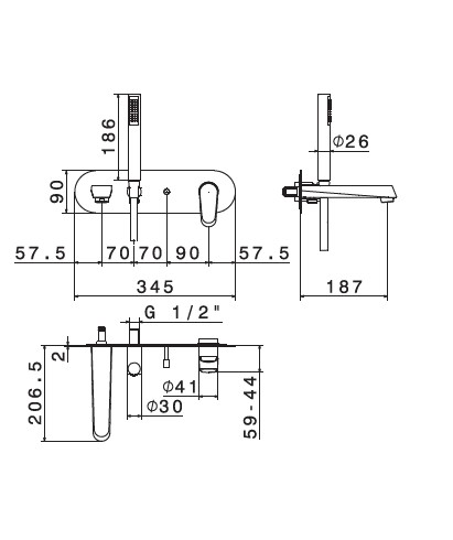 Przełącznik, wylewka ścienna i zestaw prysznicowy