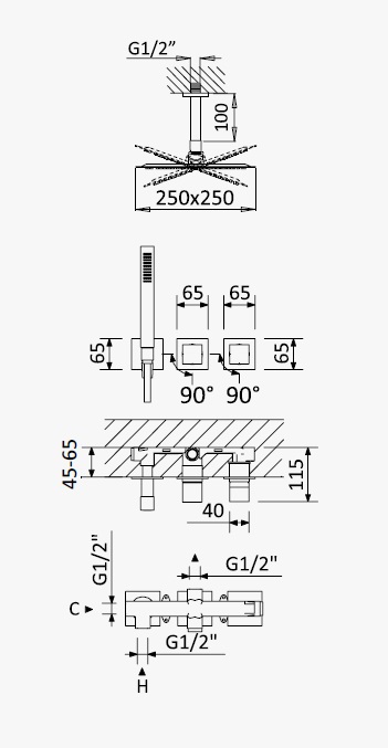 Bruma Escudo Zestaw natryskowy podtynkowy z deszczownicą 250x250 mm sufitową Chrom 1025802CR