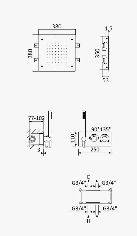 Szerokość deszczownicy: 380/380 mm