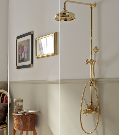 Sbordoni Londra Bateria prysznicowa termostatyczna z przełącznikiem z drążkiem, wężem, słuchawką, ramieniem i deszczownicą Ø 20 cm Natural Brass LO4171s200ON