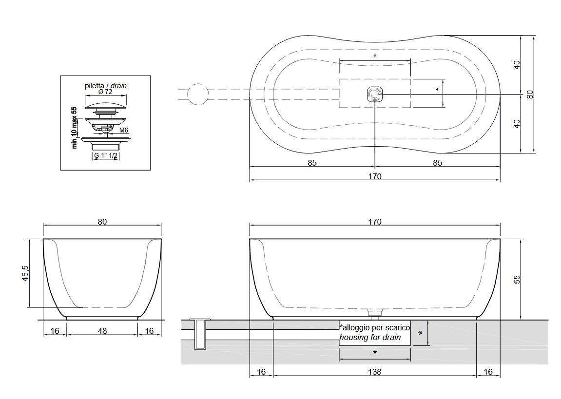 Antonio Lupi Fida Wanna wolnostojąca 170x80 cm Grigio Alpi FIDA