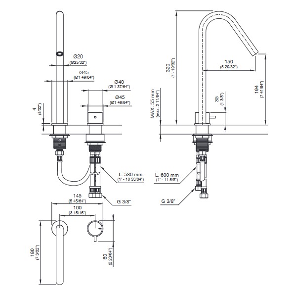 CEA Gradi Bateria umywalkowa 2-otworowa z obrotową wylewką H32 cm Satin Stainless Steel GRA21S