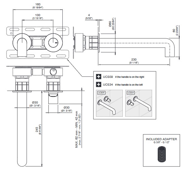 CEA Cartesio Bateria umywalkowa ścienna z wylewką 24,5 cm element zewnętrzny Satin Stainless Steel CAR09S