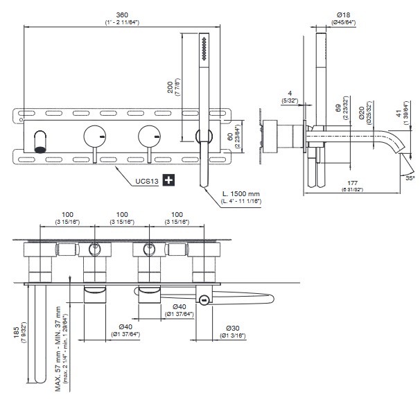CEA Milo360 Bateria wannowa ścienna z wylewką, słuchawką i wężem element zewnętrzny Satin Stainless Steel MIL86WS