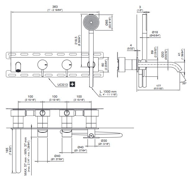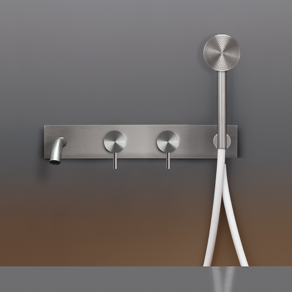 CEA Milo360 Bateria wannowa ścienna z wylewką, słuchawką i wężem element zewnętrzny Satin Stainless Steel MIL86YWS