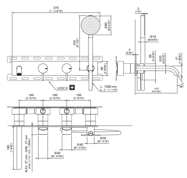 CEA Milo360 Bateria wannowa ścienna z wylewką, słuchawką i wężem element zewnętrzny Satin Stainless Steel MIL86HWS