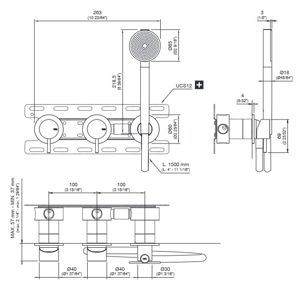 CEA Milo360 Bateria wannowa/prysznicowa ścienna z słuchawką i wężem element zewnętrzny Satin Stainless Steel MIL43YWS