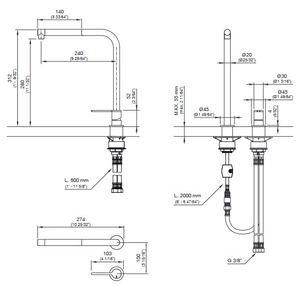 CEA Innovo Bateria kuchenna 2-otworowa z obrotową i wyciąganą wylewką Satin Stainless Steel INV84S
