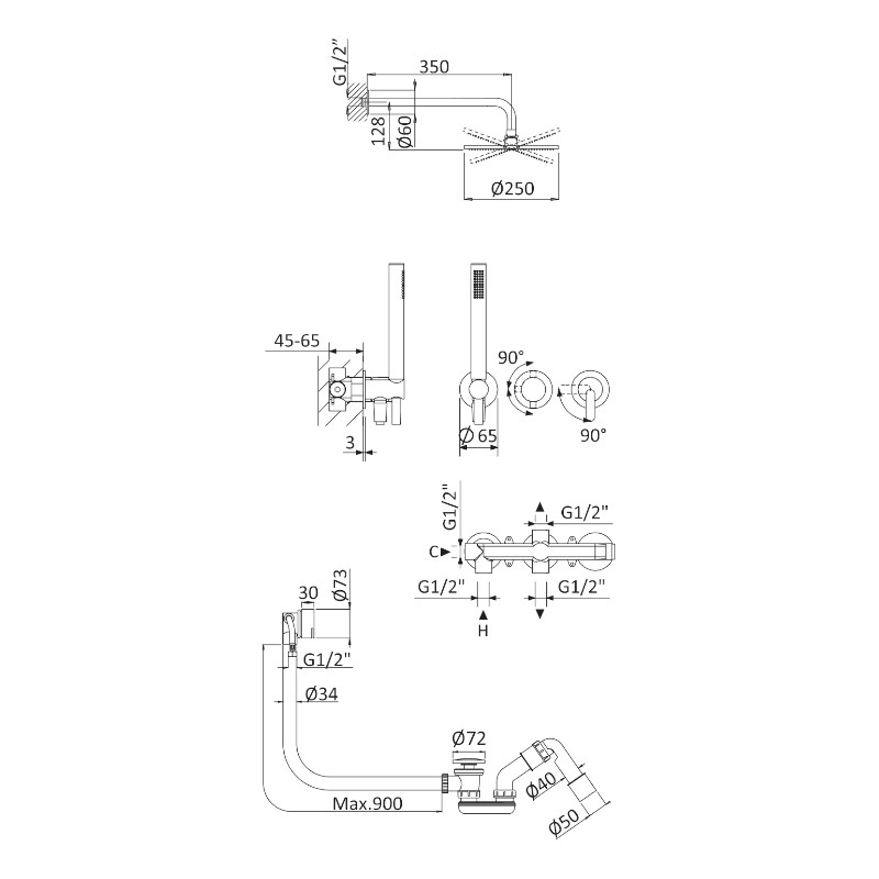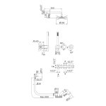 Zestaw zawiera baterię, mieszacz, słuchawkę, wąż oraz deszczownicę na ramieniu ściennym