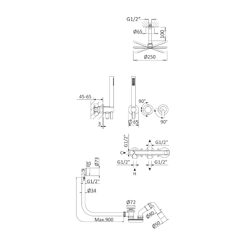 Bruma X-Alpha Zestaw wannowo-natryskowy podtynkowy z deszczownicą Ø 250 mm na ramieniu sufitowym Satin stainless steel 1863612IS