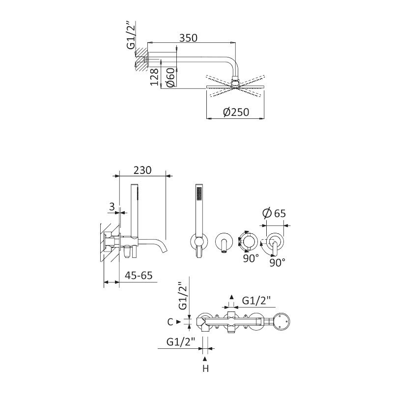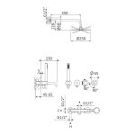 Zestaw zawiera baterię, mieszacz, słuchawkę, wąż oraz deszczownicę na ramieniu sufitowym