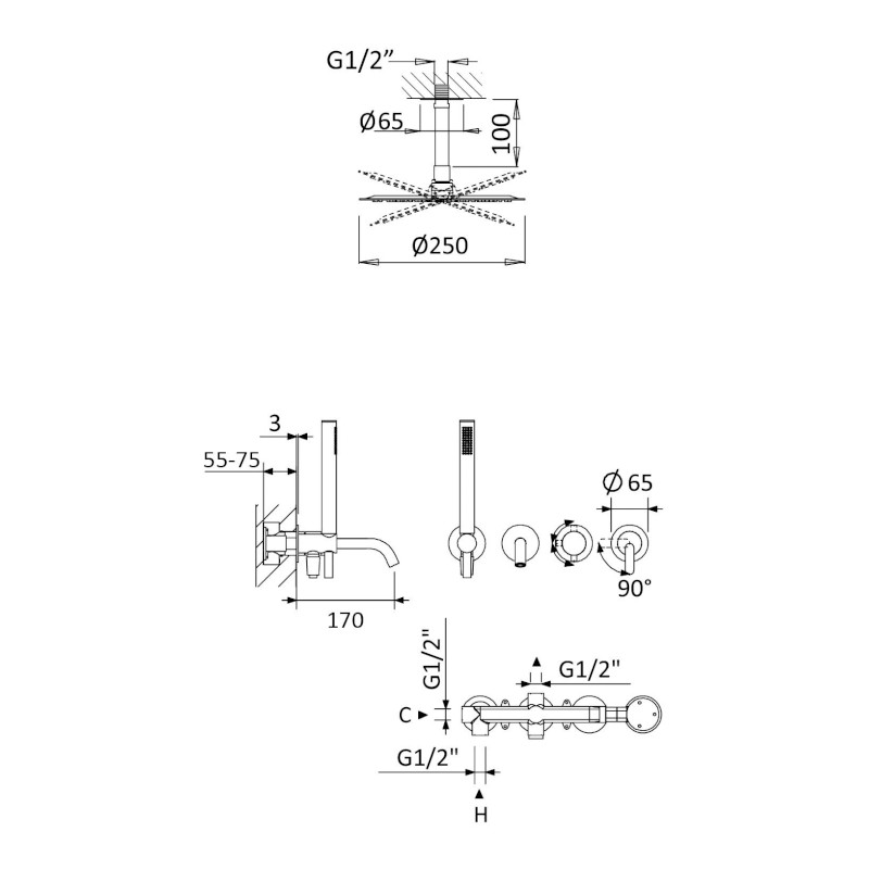 Bruma X-Alpha Zestaw wannowo-natryskowy podtynkowy z deszczownicą Ø 250 mm na ramieniu sufitowym Satin stainless steel 1864211IS