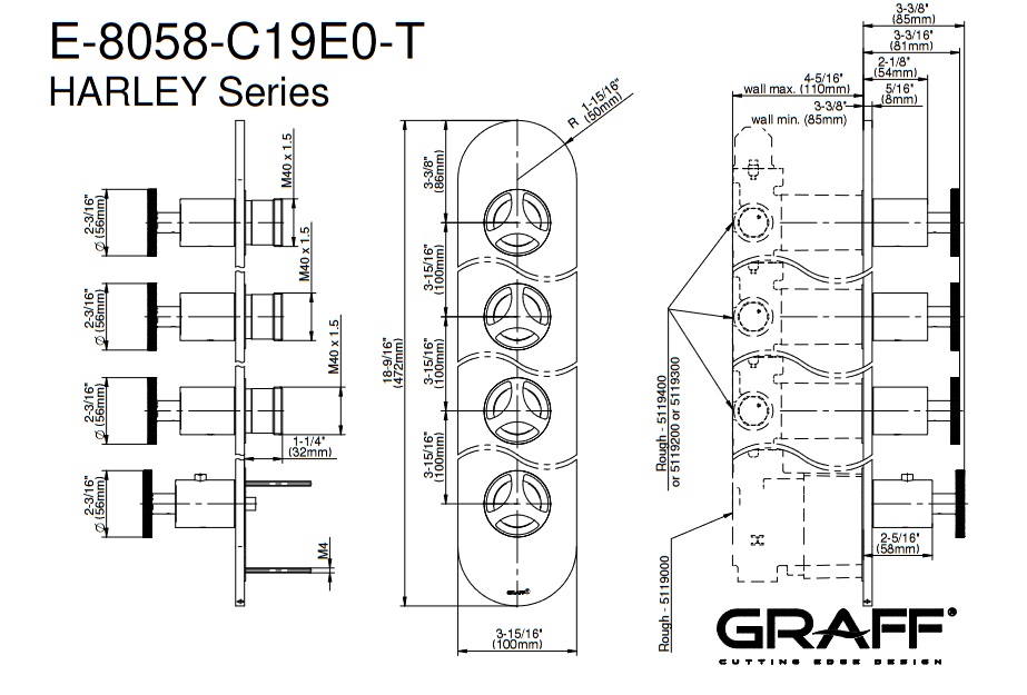 Graff Harley Bateria natryskowa podtynkowa 4-uchwytowa - element zewnętrzny Chrom E-8058-C19E0-T