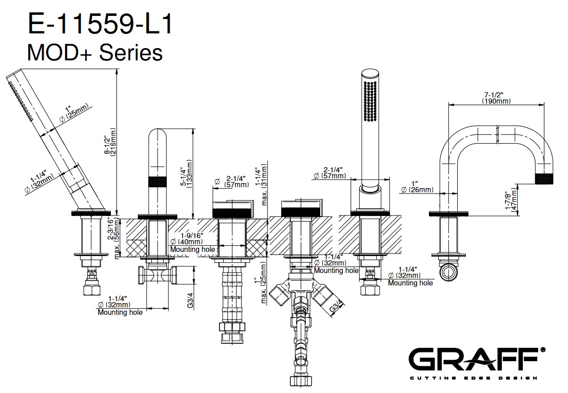 Graff MOD+ Bateria wannowa 4-otworowa nablatowa z zestawem prysznicowym Chrom E-11559-R1-L1