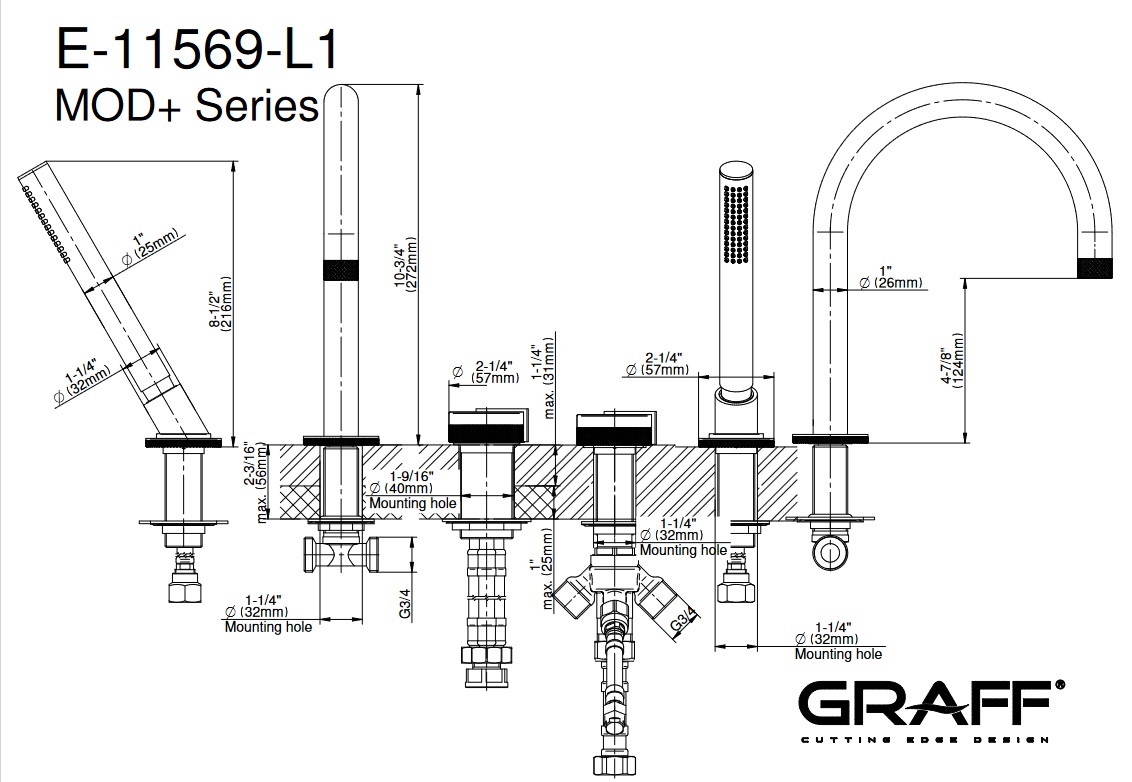 Graff MOD+ Bateria wannowa 4-otworowa nablatowa z zestawem prysznicowym PROGRESSIVE Chrom E-11569-R2-L1