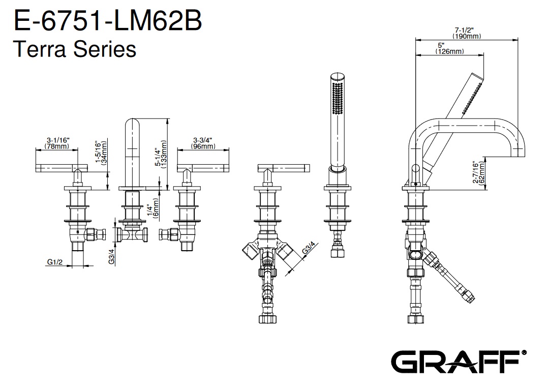 Graff Terra Bateria wannowa 5-otworowa z zestawem prysznicowym Chrom E-6751-LM62B