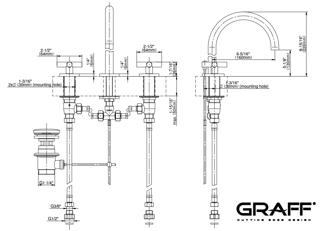 Graff M.E./M.E.25 Bateria umywalkowa 3-otworowa 160 mm z korkiem automatycznym Chrom E-6111-C17B